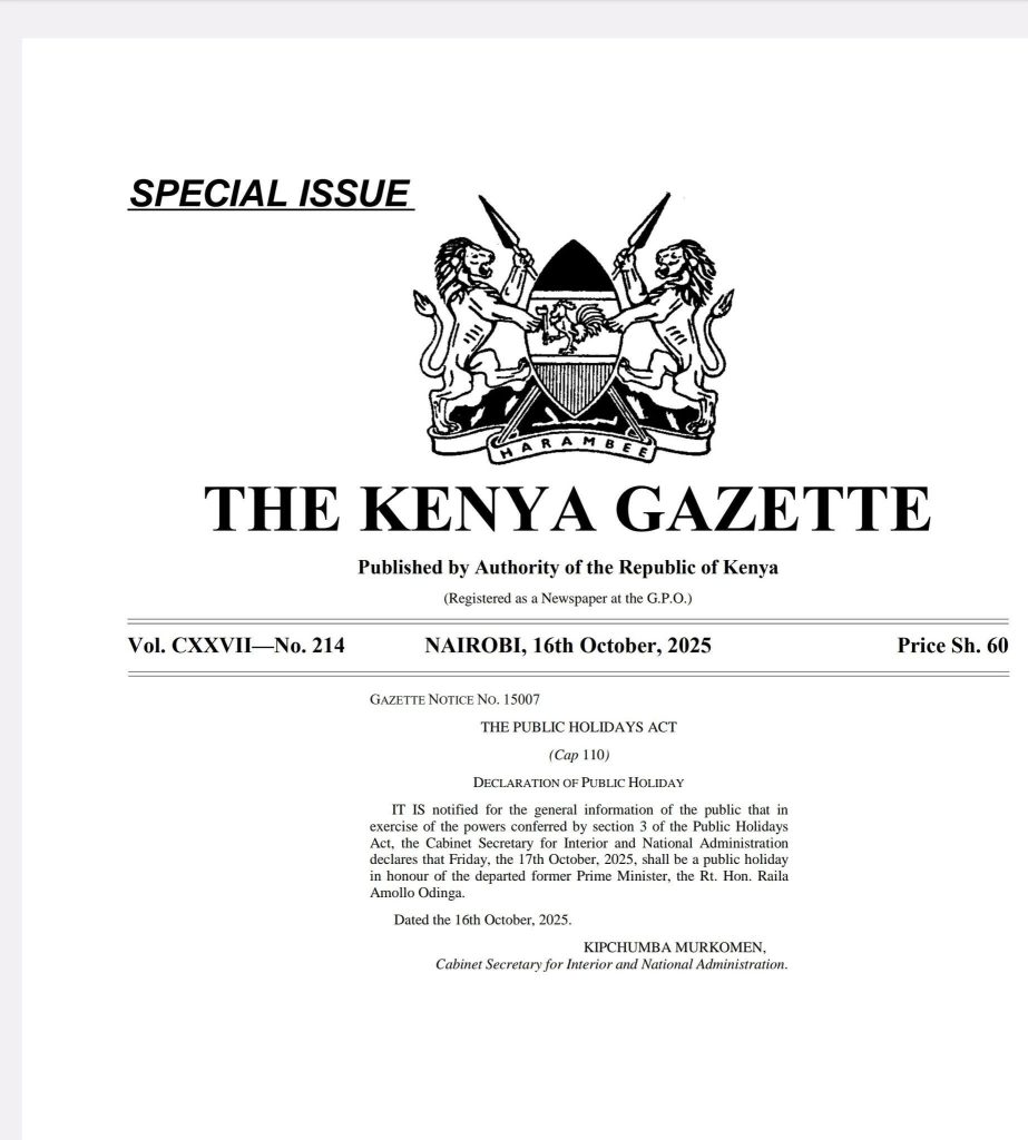 The Kenyan government has declared Friday, October 17, a public holiday to allow citizens to pay their final respects. A special gazette notice issued on October 16 by Interior Cabinet Secretary Kipchumba Murkomen confirmed the declaration, noting it is in honour of the former Prime Minister’s contribution to the nation.