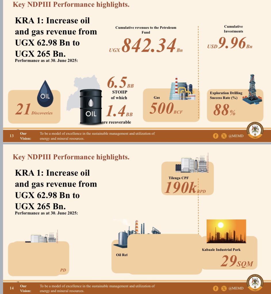 Under the extractives sector, officials highlighted major milestones achieved during NDP III, including the enactment of the Mining and Minerals Act (2022), digitisation of the mineral licensing system, formalisation of over 5,900 artisanal miners, and increased non-tax revenues from UGX 11.3 billion in FY 2022/23 to UGX 39.3 billion in FY 2024/25.