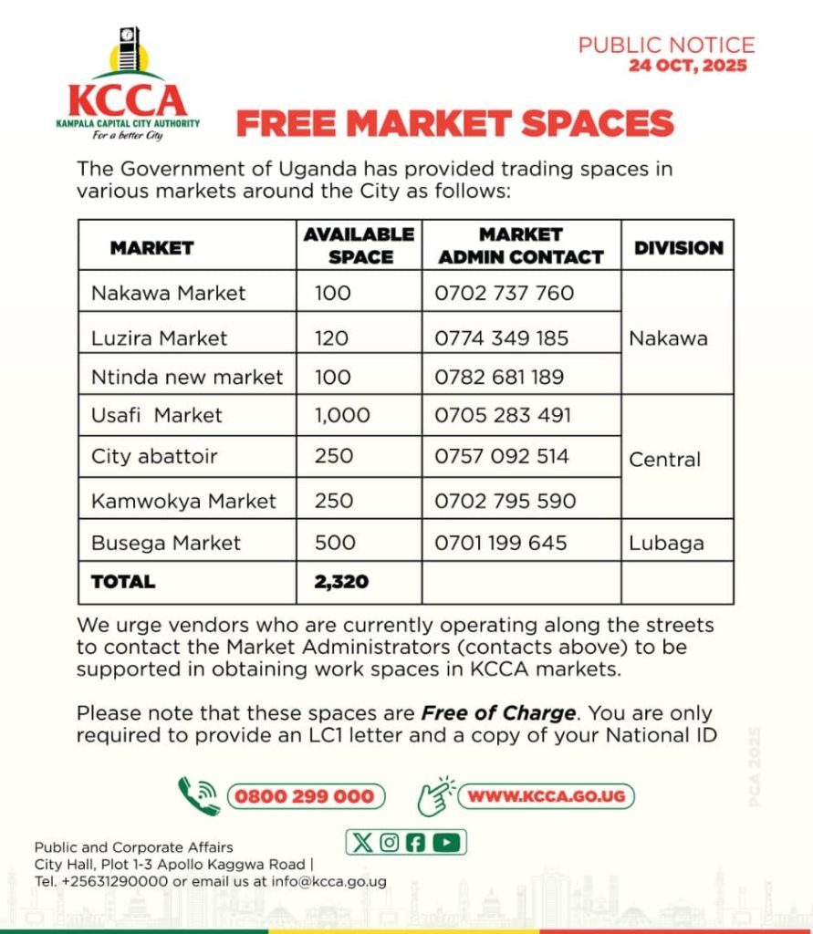 KCCA urged all street vendors to contact designated Market Administrators (listed in the notice) for assistance in securing the spaces. The agency noted that the workspaces are completely free of charge, requiring only an LC1 introduction letter and a copy of a National ID.