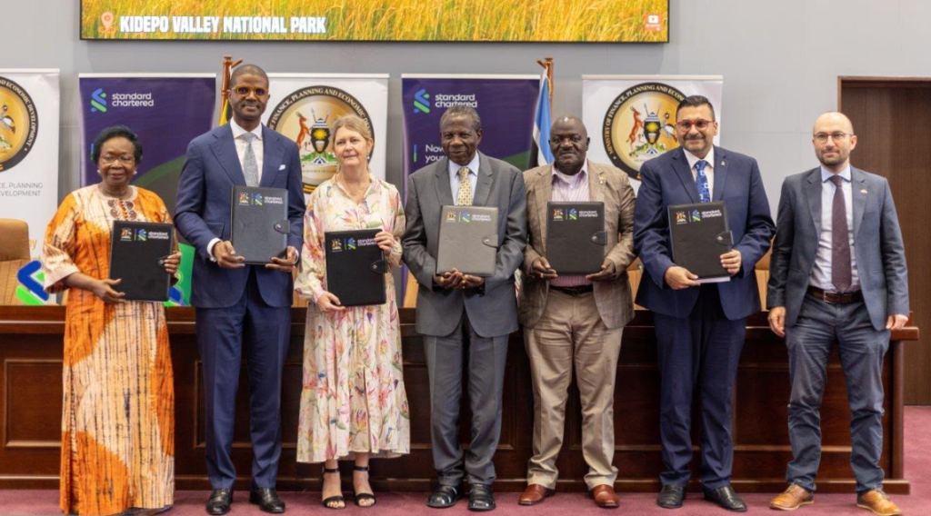 Minister of Finance, Planning and Economic Development Hon. Matia Kasaija on behalf of the Government of Uganda and Sanjay Rughani the CEO and Head of Coverage, Uganda at Standard Chartered Bank today signed three Financing Agreements at the Ministry of Finance, Planning and Economic Development to fund key government infrastructure projects aligned with the Government’s Ten-Fold Growth Strategy, aimed at expanding the economy to USD 500 billion by 2040.
