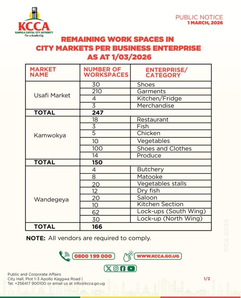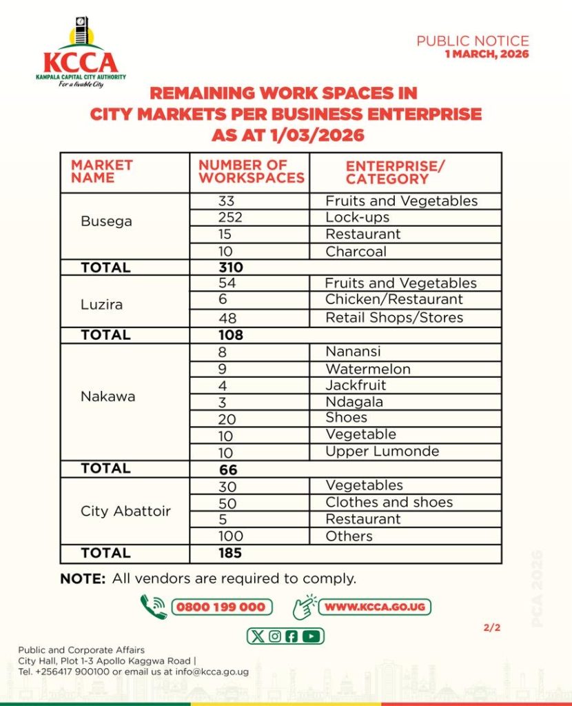 In a public notice issued on 1 March 2026, KCCA detailed the remaining workspaces across key markets including Busega, Usafi, Wandegeya, Kamwokya, Luzira, Nakawa and the City Abattoir.