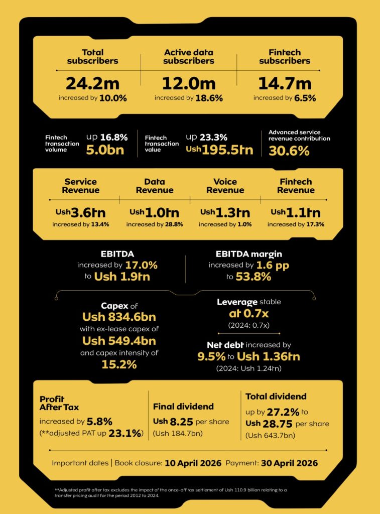 Adjusted free cash flow rose to Ush1.1 trillion, supported by strong revenue growth and efficiency programmes that delivered Ush64.1 billion in cost savings during the year.
