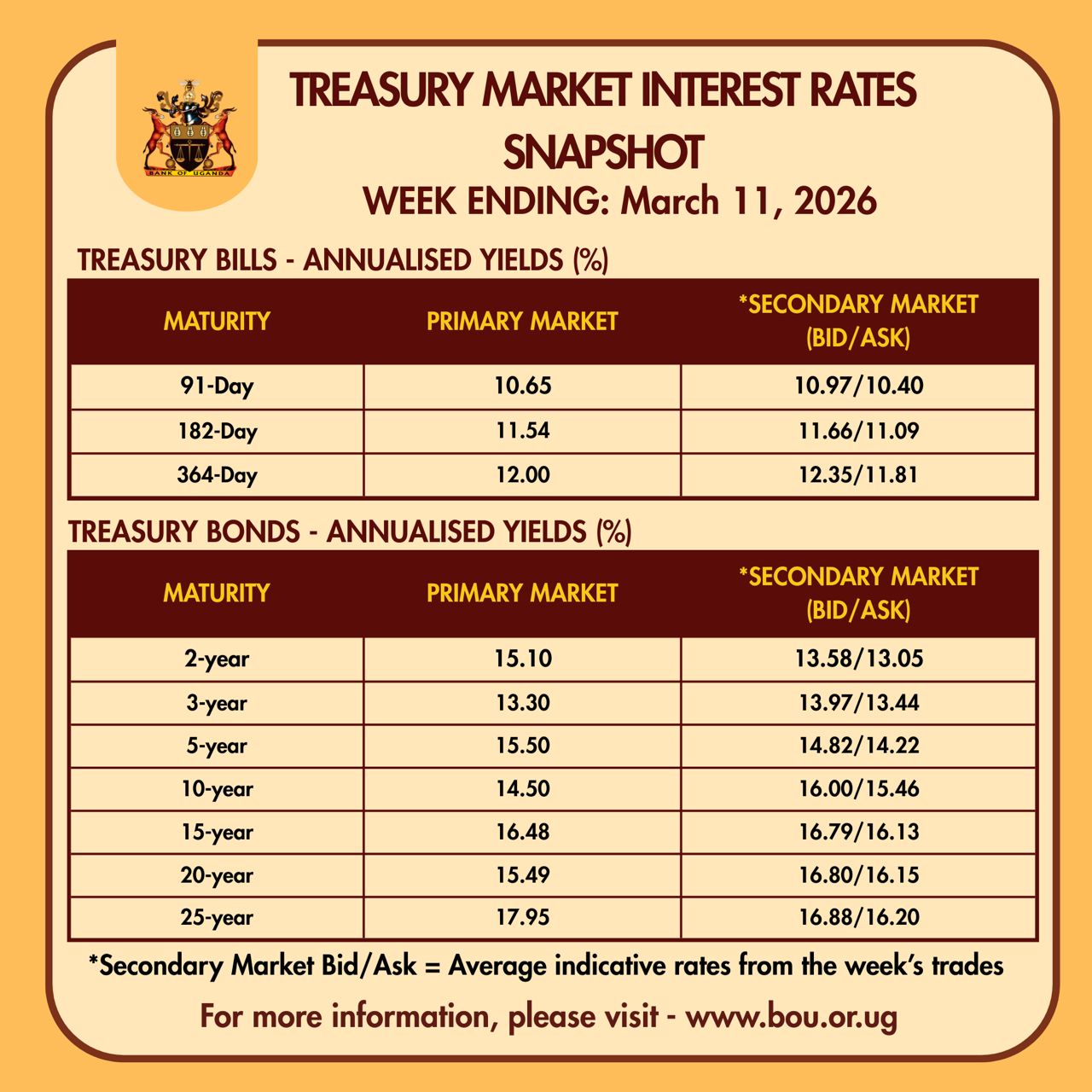 Yields on government securities remained steady in the week ending March 11, 2026, with longer-term bonds continuing to offer the strongest returns, according to the Bank of Uganda.